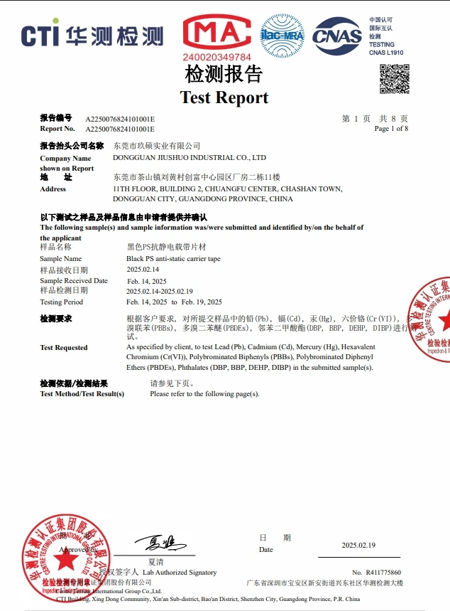 The RoHS 2.0 compliance testing covered production-grade materials used across Jiushuo’s SMT packaging product range, including carrier tape and cover tape solutions supplied for international electronics assembly.